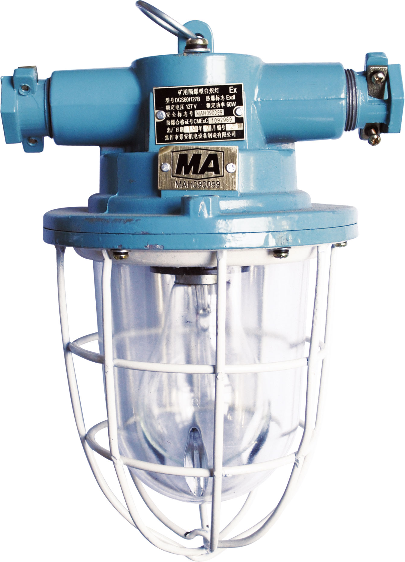 DGS60/127B礦用隔爆型白熾燈(以下簡稱60W白熾燈)。適用于具有瓦斯及煤塵爆炸危險的礦井中,可供車場及機(jī)電峒室、中心變電所、大巷運(yùn)輸、泵房等場所供照明之用。